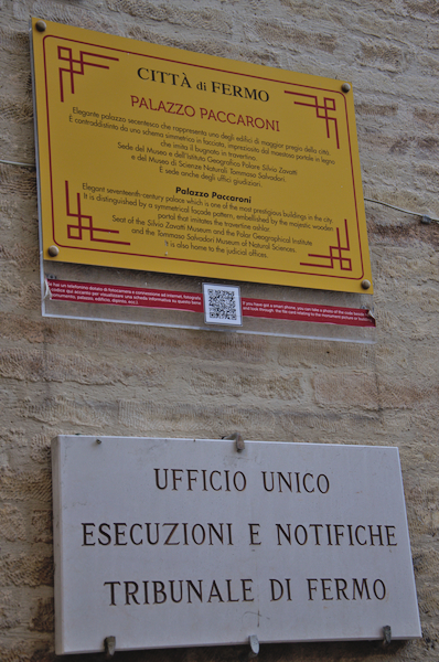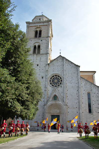 Next we climbed a narrow lane up to the Cathedral of Fermo. On the forecourt a group of flag-wavers awaited us with a demonstration of their art. The cathedral was built in the 13th century on the site of an early Christian church from the 6th century. But in the 18th century it had to give way to the present cathedral. Only the bell tower is still from the 13th century.