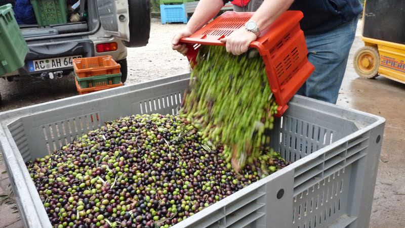 An important aspect of the quality of the oil is the freshness of the olives. The olives have to be brought to the mill within 2 to 3 days, and in the meantime the boxes have to stand somewhere cool and dry. The tip is also to leave some leaves in the boxes, that will cause some ventilation between the olives. Otherwise the olives start to produce mould and acid; not only the oil gets bad, but the olive mill may even reject the batch.