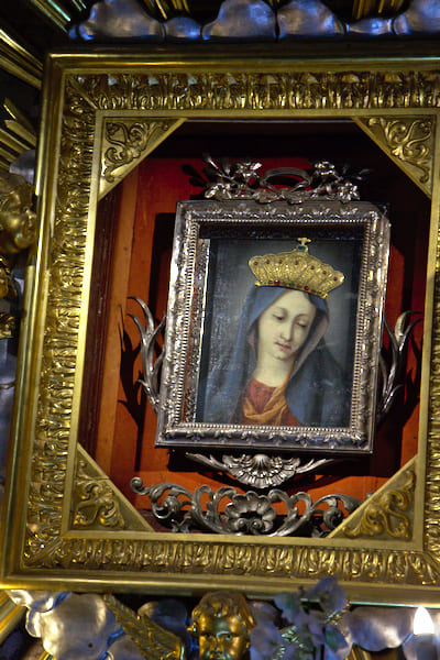 Links in het midden valt een verlicht schilderij op in een kapel. Het is de Madonna kapel ontworpen door architect Vanvitelli voor het schilderij Koningin van alle Heiligen. Het kunstwerk schonk een Venetiaanse koopman aan de kerk als ex-voto om Maria te danken voor zijn redding tijdens een schipbreuk. Het zou in 1796 een wonder verricht hebben: Tijdens de Napoleontische tijden zou Maria aan de biddende gelovigen haar ogen geopend hebben en geglimlacht, dit enkele dagen lang. Het werd als een positief teken aanzien en inderdaad Napoleon zou de schatten van de Dom en de kerk zelf met rust laten, eenmaal dat hij oog in oog met het schilderij kwam.