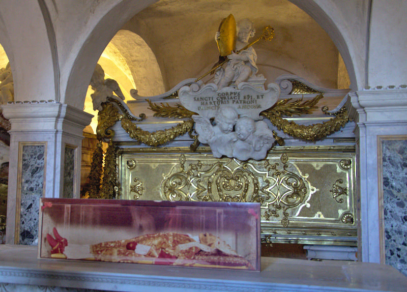 De heilige kan nog altijd aanbeden worden in de crypte van de Dom van Ancona. Een prachtige kerk, op de heuvel Guasco fier uitkijkend over de haven en op geruime afstand al goed zichtbaar.