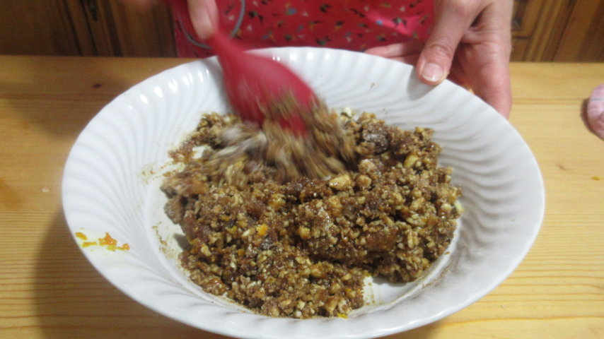 Für die Füllung weicht man die Sultaninen in etwas Mistra-Likör oder Rum ein. Die Walnüsse, Mandeln und die getrocknete Feigen werden gehackt und dann zusammen mit dem Zucker, der geriebenen Orangenschale, den eingeweichten Sultaninen, dem Kaffee, dem Paniermehl und dem Sapa (oder dem eingekochten Traubensaft) gut vermischt. Diese Masse ein paar Stunden oder über Nacht ruhen lassen.