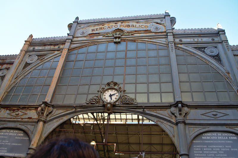 Kurz vor Mittag wollen wir noch einen Blick in die Markthallen von Ancona werfen, dem „Mercato delle Erbe“. Vom Corso Mazzini aus sehen wir etwas versteckt, weil zurückliegend, den Jugendstil-Eingang des Mercato.