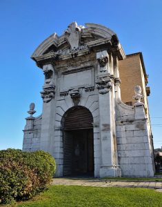 Wir überqueren die Hauptstraße und erreichen über eine Treppe die Porta Pia, einen monumentalen Torbogen, der beidseitig mit Darstellungen maritimer Ungeheuer und Muscheln verziert ist. Er wurde von Papst Pius VI als Eingang zur alten Stadt erbaut.