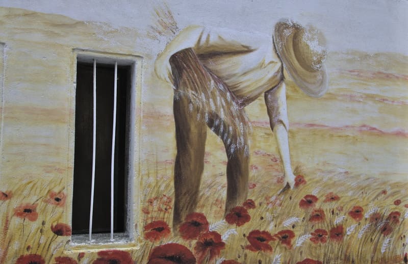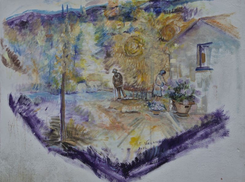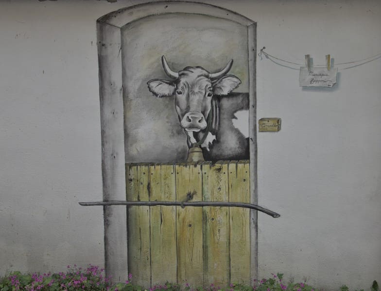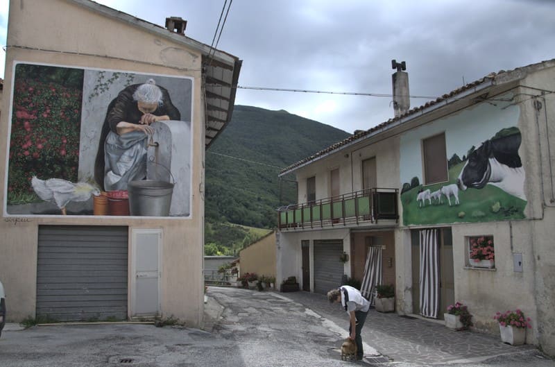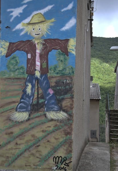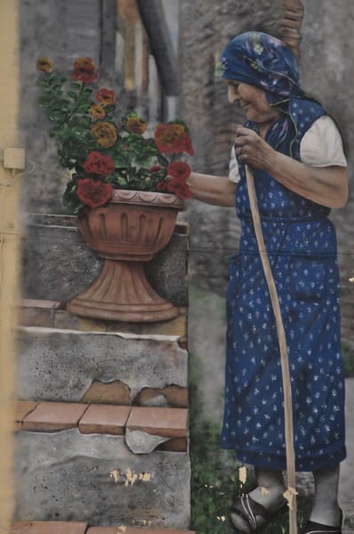 Die Bewohner, die wir treffen, begrüßen uns alle freundlich und freuen sich über unser Interesse. Besonders auffallend ist ein Wandbild einer überlebensgroßen alten Frau, der 90-jährigen „zia Itali“, die wir ebenfalls kennen lernen. Als sie ihr Porträt an der Wand sah, hätte sie den Künstler mit den Worten überrascht: „Aber ich bin klein, und du hast mich so groß gemacht, nicht wahr?“ Leider hat sie keine Zeit, sich fotografieren zu lassen, da sie in ihren Gemüsegarten gehen musste, um ihre Pflanzen zu gießen. Mit festem Schritt geht sie bis an den Rand des Dorfes, wo sich die Gärten befinden.
