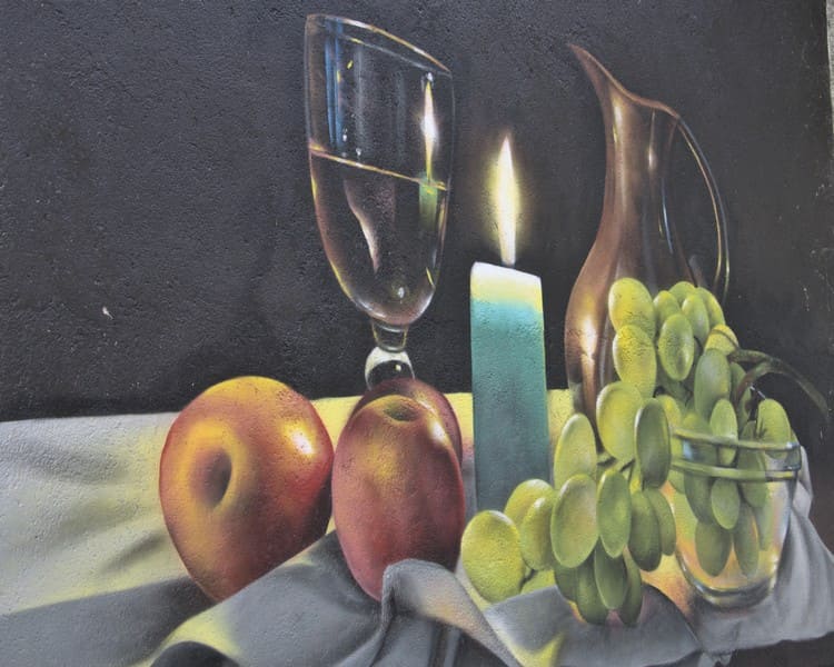 Seit einigen Jahren kommt er auf Einladung des örtlichen Vereins Fenalc nach Cacciano, um jeweils 2 Kunstwerke zu schaffen. In einer Garage sehen wir die zahlreichen Materialien, die er braucht. Zurzeit arbeitet er an einer Kopie eines Gemäldes.