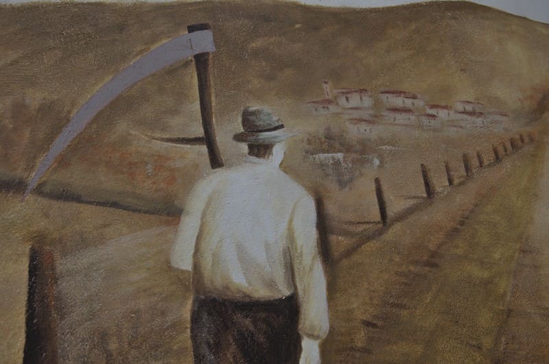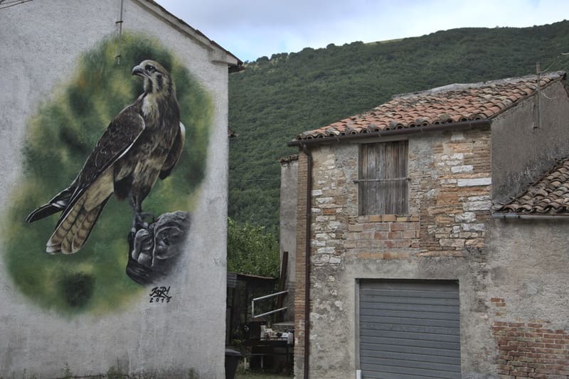 Der kleine Weiler liegt südwestlich von Fabriano. Über eine wunderschöne Straße durch die Berge passieren wir das Schild „Murales von Cacciano“, um schließlich in das Dorf zu gelangen, von Stille umgeben. Die Straße endet hier, weiter als Cacciano kommt man nicht. Wir parken direkt an der Straße und sehen die Vereinsbar des örtlichen Dorfverbandes (Circolo Cittadino), die gerade renoviert wird. Und wir entdecken die ersten Wandbilder.