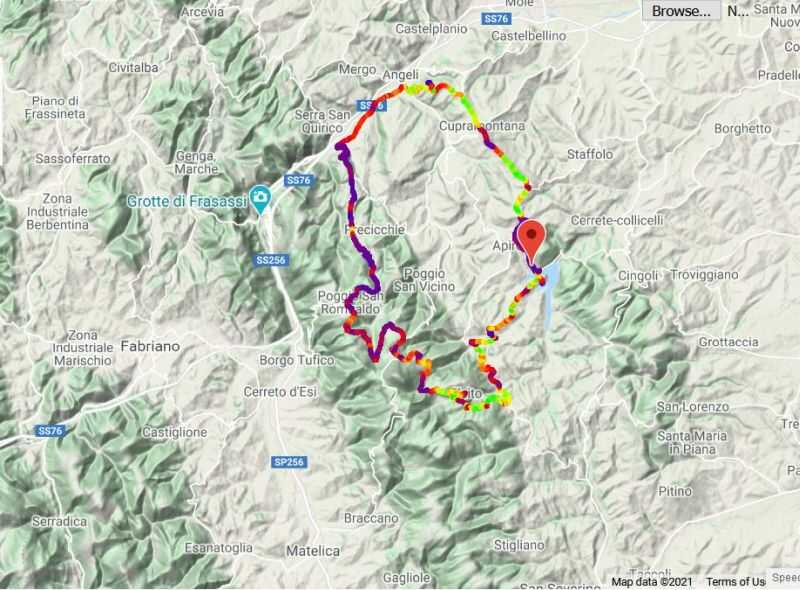 Otto startet Richtung Apiro zur letzten Etappe, die ab jetzt nur noch über Asphalt führt und je nach Tageszeit etwas mehr befahren sein kann. Vor Apiro nimmt er die Abbiegung nach Cupramontana und hält sich auch an der nächsten T-Kreuzung Richtung Cupramontana, an der Abbazia Beato Angelo vorbei und durch Cupramontana durch Richtung Poggio Cupro zu unserem Ausgangspunkt.